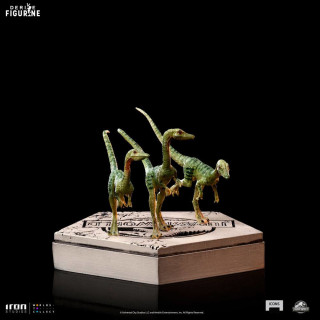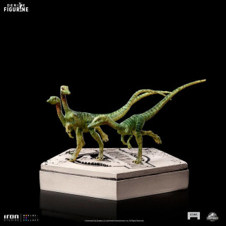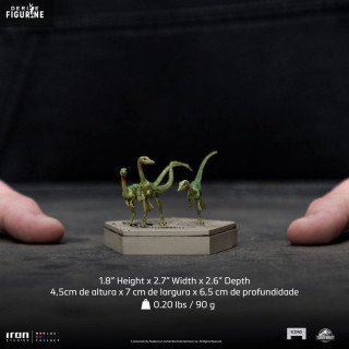 Figurine officielle de Compsognathus en résine mesurant environ 4,5 x 7 x 6,5 centimètres. Elle est issue de la collection Icons. Le fabricant est Iron Studios.