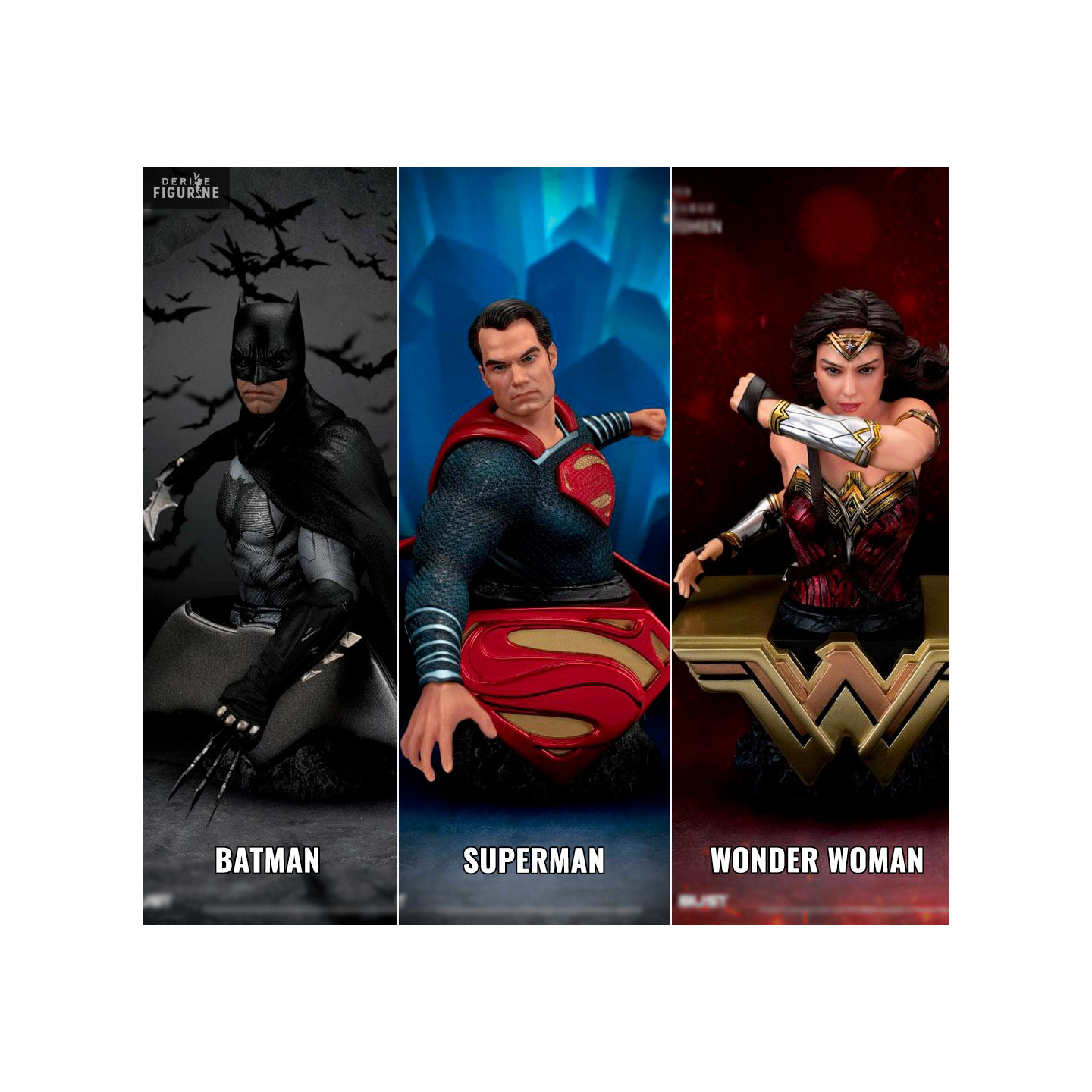 La Justice League vient tout juste de se reformer sous vos yeux, car vous avez la possibilité de vous offrir un buste des trois héros principaux. Il y a donc le ténébreux Batman équipé de ses batarang, Superman et sa force surhumaine et enfin la non moins combattante Wonder Woman.