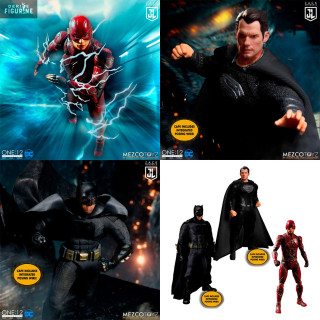 Figurines officielles de Batman, Flash et Superman mesurant environ 15 à 17 centimètres de haut, à l'échelle 1/12. Elles sont issues de la collection One:12. Le fabricant est Mezco Toys.