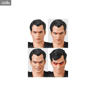 Sur cette figurine, on peut voir que Superman n'est pas vraiment dans son état normal puisqu'il s'agit de la version avec son costume noir. C'est comme cela qu'il apparaîtra après sa résurrection, et vous pouvez voir qu'il a quatre visages interchangeables plus ou moins en colère, dont un qui s'apprête carrément à tirer des lasers.