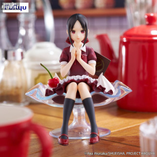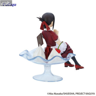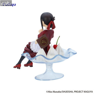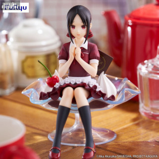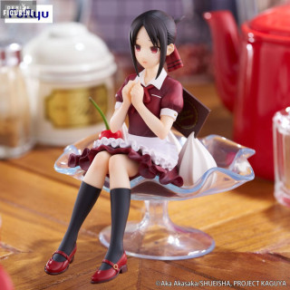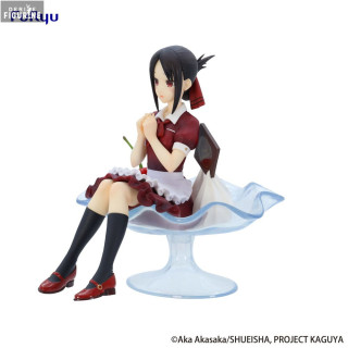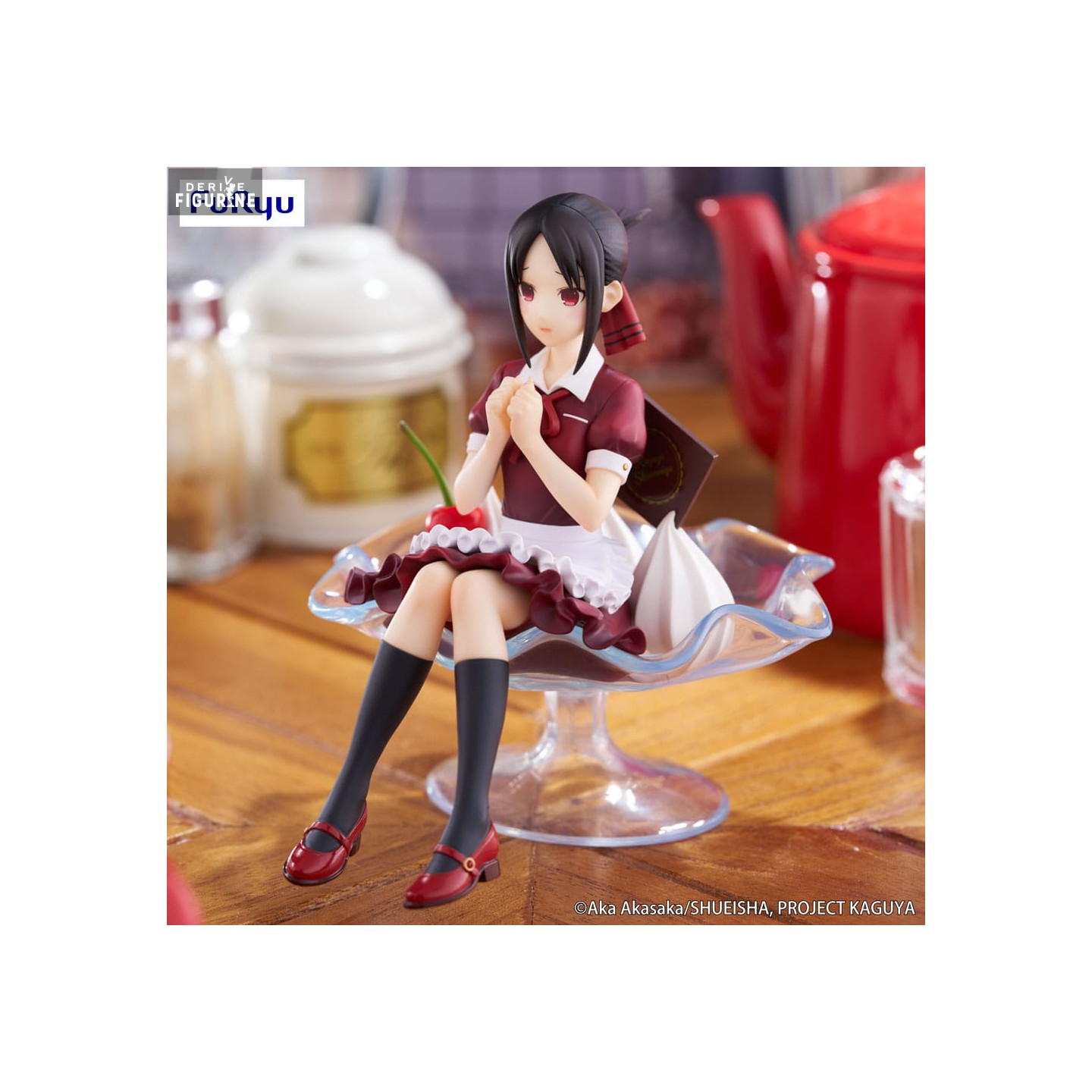 Cette figurine présente Kaguya Shinomiya dans une pose assise charmante et délicate, installée dans un verre à parfait, soulignant son côté sucré et sophistiqué. Vêtue d'une tenue de serveuse de style café, avec une robe bordeaux et un tablier blanc bordé de dentelle, Kaguya est représentée dans un moment de tranquillité, les mains jointes devant elle et une expression douce sur le visage. Ses cheveux noirs soigneusement coiffés et ses yeux rouges expressifs sont fidèlement reproduits, capturant parfaitement son apparence élégante.