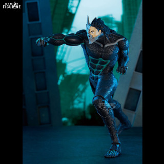 Sur cette figurine Grandista, Kafka Hibino est capturé en plein élan : un poing défiant dressé vers l’avant, le corps tourné, prêt à bondir sur son adversaire. Son half-mask osseux, signature de sa forme kaiju, dévoile un œil humain intense. Le torse et les membres sont recouverts d’une carapace sombre texturée et parcourue de lignes turquoise luminescentes, tandis qu’un rocher poli sert de socle, évoquant un champ de bataille urbain.