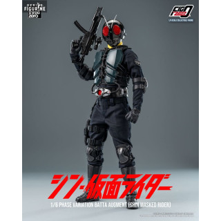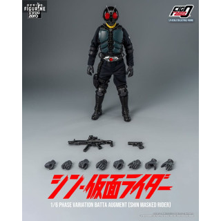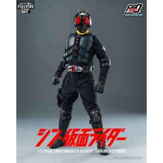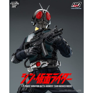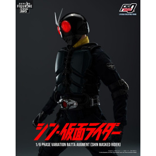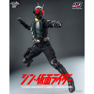 Figurine officielle de Phase Variation Batta Augment (Shin Masked Rider) mesurant environ 30 centimètres de haut, à l'échelle 1/6. Elle est issue de la collection FigZero. Le fabricant est ThreeZero. La moto est vendue séparément.
