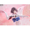 Le visage de Shiki, sculpté avec une grande finesse, exprime une détermination sereine, tandis que ses cheveux flottent élégamment dans le vent, ajoutant une touche de dynamisme à la scène. La figurine repose sur un socle décoratif qui évoque une mare de pétales de cerisier, renforçant l'atmosphère poétique et mystique de la série.
