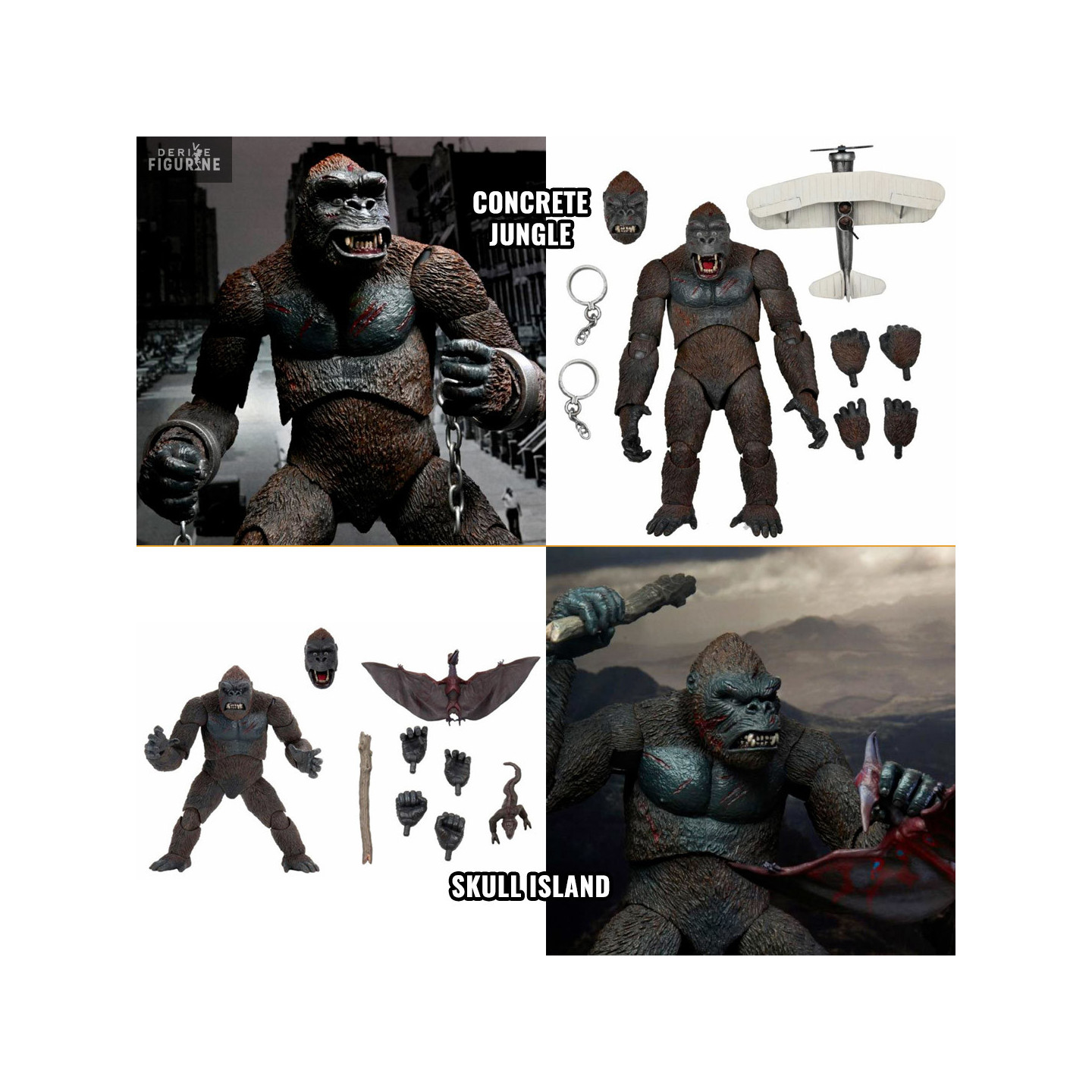 NECA propose deux figurines de la gamme des Ultimate pour l'incroyable King Kong et vous avez donc le choix entre deux versions ! Soit la King Kong Skull Island vendue avec divers visages et mains interchangeables ainsi que différents monstres à l'image du ptéranodon ou bien alors vous pouvez opter pour la version Concrete Jungle vendue également avec accessoires et mains interchangeables dont le planneur !