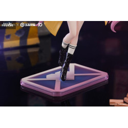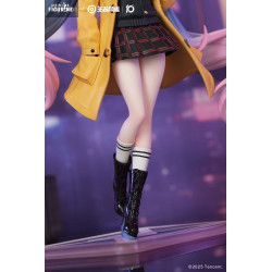 Sa tenue combine une jupe plissée à carreaux de style uniforme, une veste jaune moutarde ouverte, et un pull gris foncé avec chemise intégrée. Les bottines noires vernies montantes apportent une touche rock, tandis que les chaussettes blanches rayées ajoutent un accent scolaire. Le socle triangulaire rose et violet est orné d’un motif graphique sobre qui ancre la figurine dans une esthétique contemporaine.