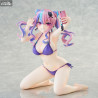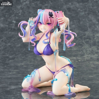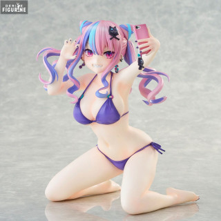 Kurara Tokishima est représentée ici dans un bikini violet audacieux, tenant un smartphone rose pour un selfie coquin. Ses longs cheveux bicolores, mêlant des teintes roses et bleues, sont coiffés en deux couettes qui ajoutent une touche de fantaisie et de charme juvénile. La figurine est pleine de détails captivants, des mèches de cheveux délicatement sculptées aux accessoires minutieusement réalisés, comme le nœud en forme de chat sur ses cheveux.