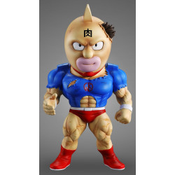 Le set de figurines met très clairement en avant leurs silhouettes contrastées. Kinnikuman apparaît dans sa forme classique : torse massif, peau couleur chair, collant jaune, bottes rouges et haut bleu orné de son emblème. Son visage expressif, avec l’inscription 「肉」 sur le front, est sculpté avec un style volontairement caricatural typique des Sofvi Defo. Goldman, à l’inverse, porte son armure métallique argentée, détaillée de segments anguleux, de plastrons et d’un casque orné d’une corne centrale. Son manteau, ses gants rouges et ses touches dorées lui donnent une allure encore plus majestueuse et intimidante.