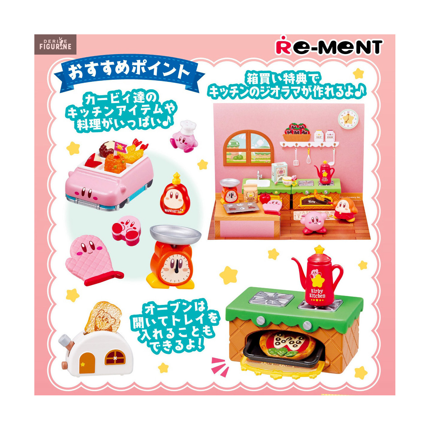 Figurines officielles de Kirby en PVC. Elles sont issues de la collection Hungry Kirby Kitchen. Le fabricant est Re-Ment.