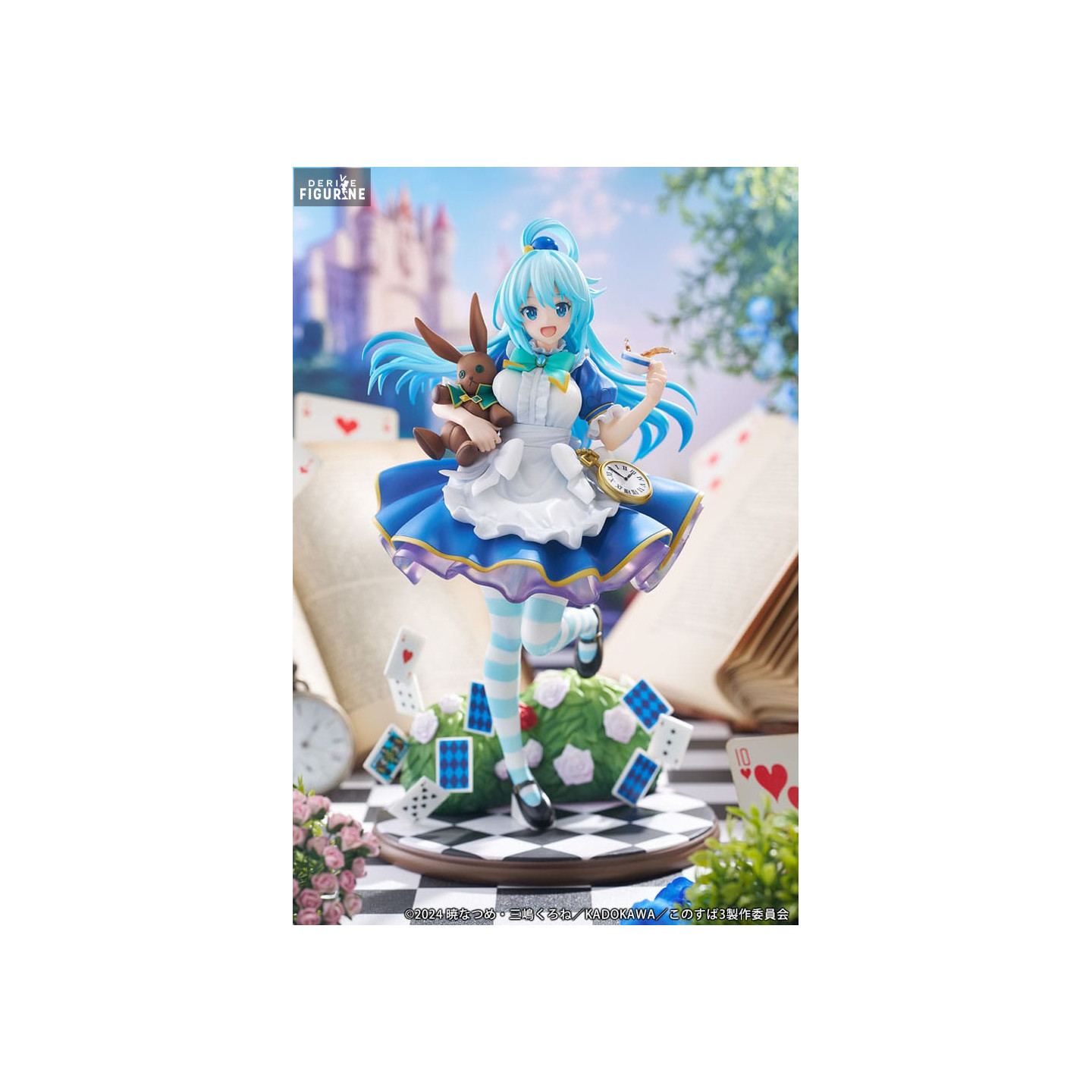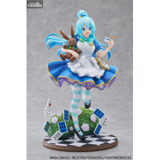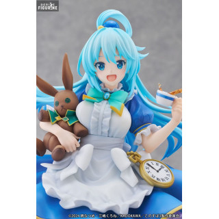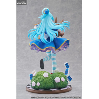 Cette figurine présente Aqua dans une tenue inspirée d'Alice au Pays des Merveilles, avec une robe bleue ornée d'un tablier blanc, des bas rayés bleus et blancs, et des accessoires rappelant l'univers fantastique du conte. Elle est accompagnée d'un lapin en peluche, d'une montre à gousset dorée et d'un décor rempli de cartes à jouer et de roses, renforçant l'esthétique onirique et ludique de cette interprétation.