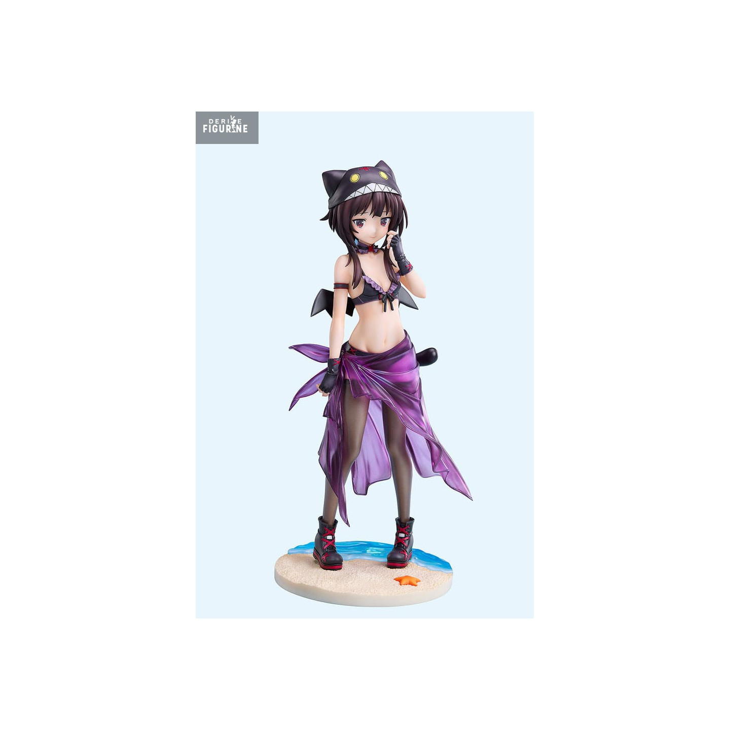 Megumin, l’Archimage explosive et excentrique de KonoSuba, est ici représentée dans une version estivale qui mêle malice et élégance. Abandonnant son habituel manteau de mage pour un maillot de bain noir orné de détails subtils, elle conserve néanmoins son style unique avec une cape légère et un paréo violet translucide qui flottent légèrement, ajoutant une touche de dynamisme à sa posture. Son chapeau, inspiré de Chomusuke, son adorable compagnon félin, renforce l’aspect ludique et attachant de cette figurine.