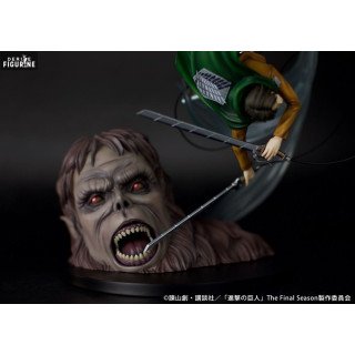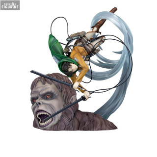 La figurine est sculptée avec une précision incroyable, chaque détail des vêtements de Levi, de son équipement, et de l'anatomie du Titan Bestial est minutieusement travaillé. Les couleurs sont vives et fidèles à l'anime, et les matériaux utilisés garantissent une durabilité et une finition de haute qualité. La base de la figurine, représentant la tête du Titan Bestial, est également soigneusement détaillée, complétant cette œuvre d'art impressionnante.