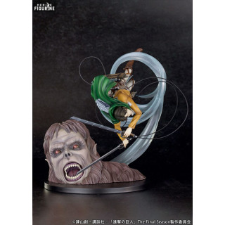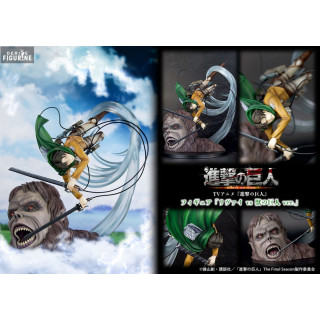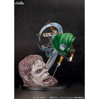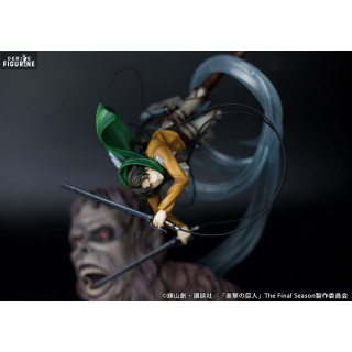 Figurine officielle de Levi vs Beast Titan en PVC mesurant environ 28 centimètres de haut. Le fabricant est Proof.