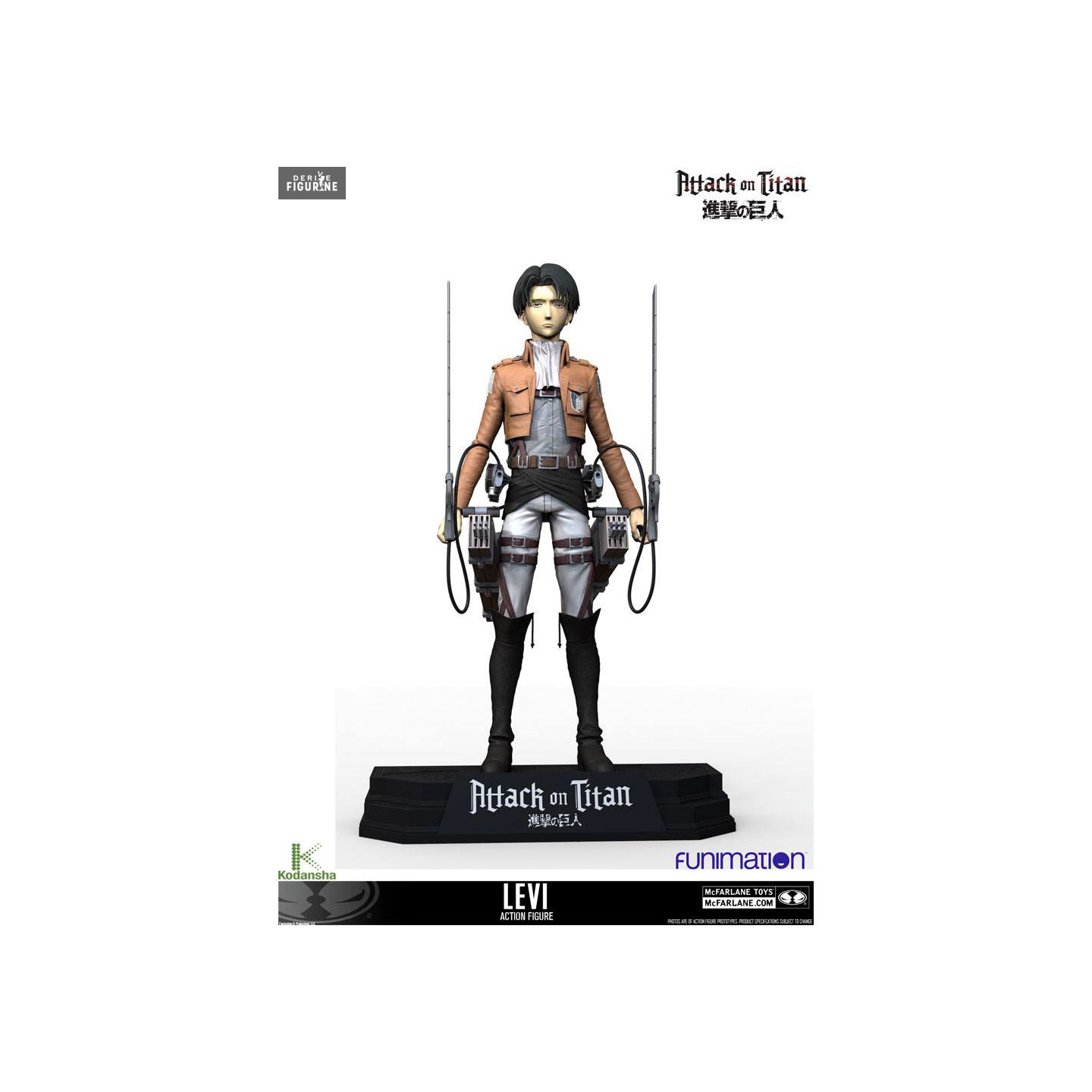 Figurine officielle de Levi Ackerman en PVC mesurant environ 18 centimètres de haut. Le fabricant est McFarlane Toys.