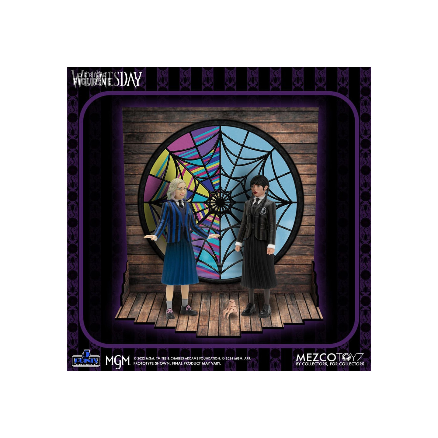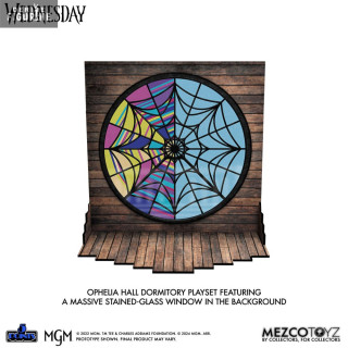 Ce coffret comprend Wednesday et Enid vêtues de leurs uniformes de l'Académie Nevermore, ainsi que le fidèle serviteur de Wednesday, Thing. En bonus, vous trouverez un décor de chambre d'internat qui, une fois assemblé, présente la chambre Ophelia Hall, avec son dortoir partagé et une immense fenêtre en vitrail en arrière-plan.