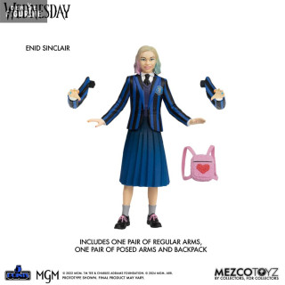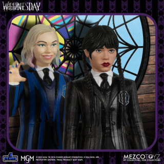 Figurines officielles Mercredi & Enid mesurant environ 10 centimètres de haut. Elles sont issues de la collection 5 Points. Le fabricant est Mezco Toys.