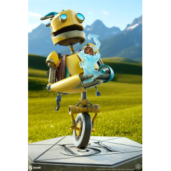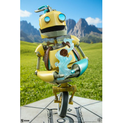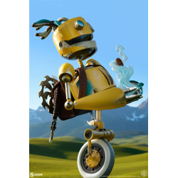 La figurine se fonde strictement sur ce que l’on voit : un corps métallique jaune, un grand œil bleu circulaire sur le torse, des bras articulés et une tête aux oreilles mécaniques décalées. F.C.G. repose sur une roue unique qui lui sert de base de déplacement. Une petite forme énergétique bleutée, semblant flotter près de son torse, ajoute un effet dynamique. La pose légèrement inclinée et les détails de boulons, plaques et câbles renforcent l’aspect artisanal et attachant du robot. Le socle texturé en forme de dalle soutient l’ensemble.