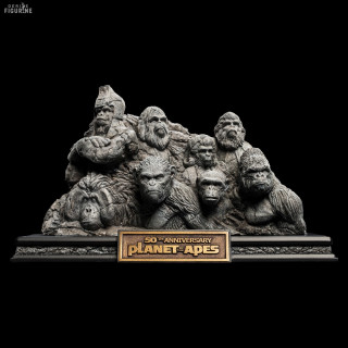 Cela fait cinquante ans que la planète des singes est sortie chez nous et pour l'occasion, Weta a décidé de sortir une statuette des grands singes du film. Voici donc un représentation de Ursus, Zaius, Zira, Cornelius, Maurice, Rocket, César et Lucas, à l'image du Mont Rushmore aux États-Unis.