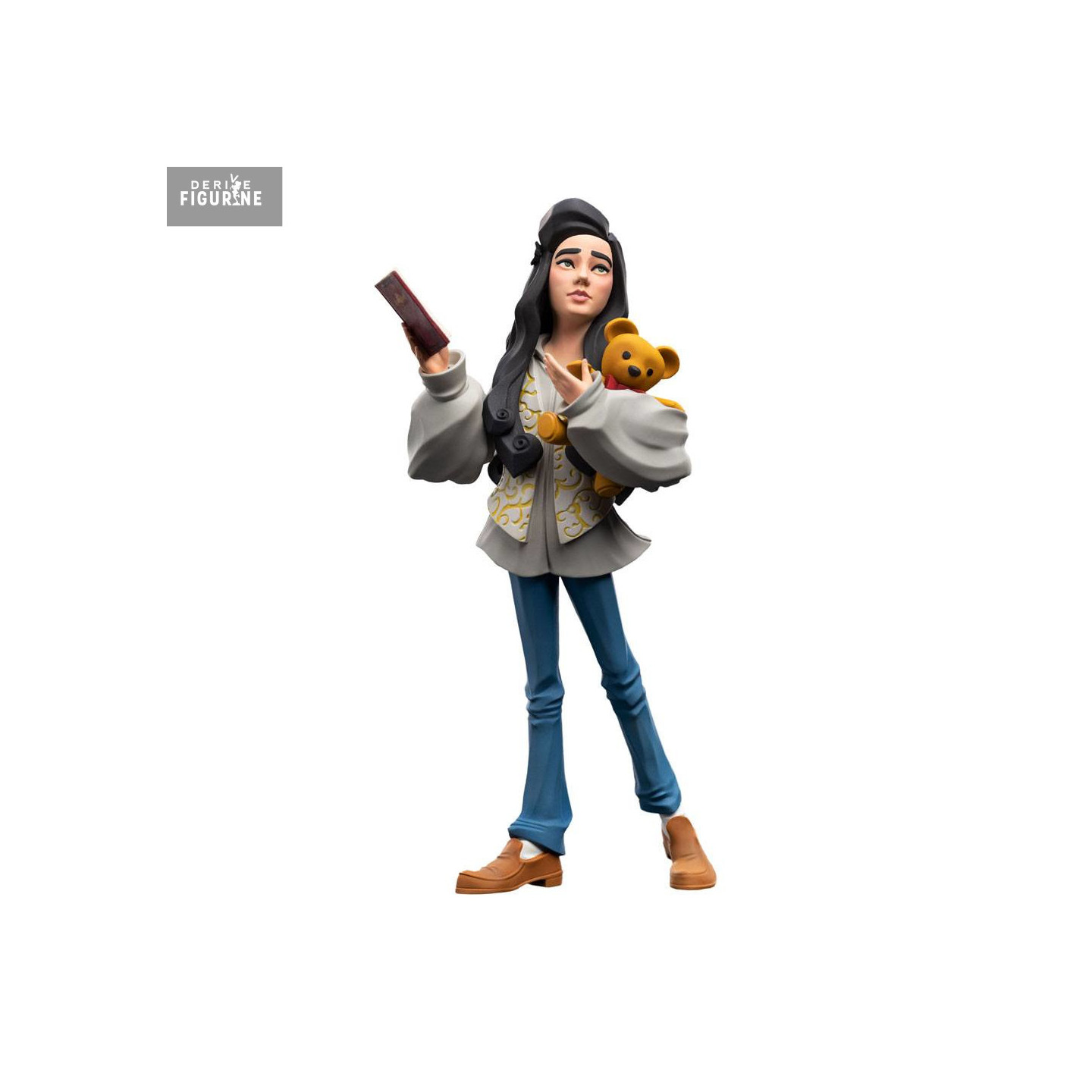 Le design Mini Epics adopte un style semi-réaliste et stylisé : la veste ample aux motifs baroques, le pantalon évasé et les chaussures rétro de Sarah sont fidèlement reproduits, tout comme sa longue chevelure sombre et ses traits expressifs. L’ours en peluche Chester, compagnon réconfortant, est calé sous son bras gauche, tandis que le grimoire ouvert dans sa main droite révèle des symboles gravés en relief.