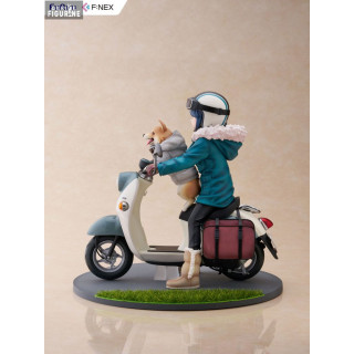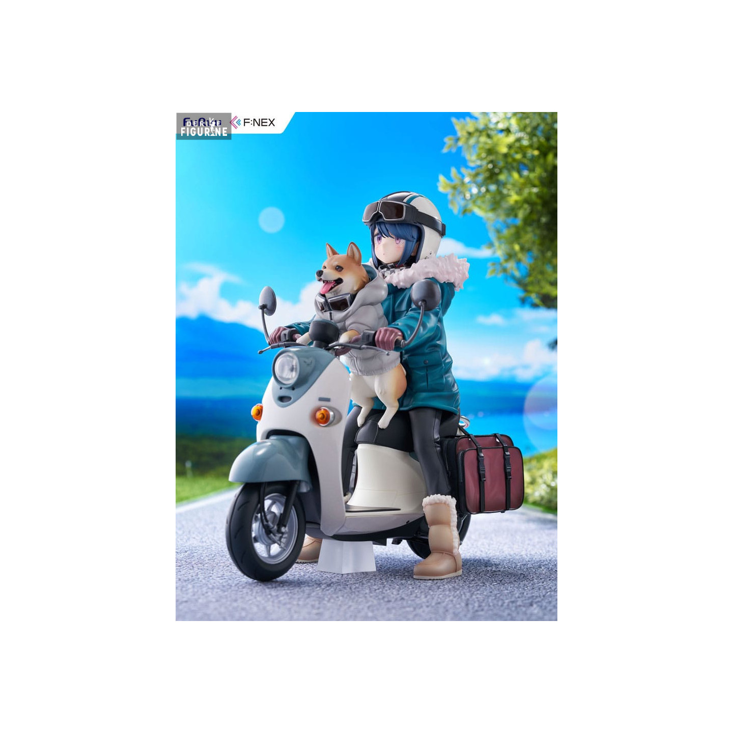 Rin Shima, connue pour son amour du camping en solo et son tempérament calme, est représentée ici dans une scène emblématique. Assise sur son scooter avec son fidèle chien dans un sac à dos, elle est prête à partir pour une nouvelle aventure en plein air. La posture détendue de Rin, combinée à son équipement de camping, reflète son esprit d'exploratrice et son appréciation de la nature.