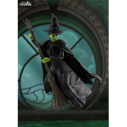 La figurine la montre de dos, dans une posture pleine de dignité, légèrement tournée, balai en main. Sa peau verte ressort sous la lumière du couchant, contrastant avec sa longue robe noire texturée, son chapeau pointu tordu et ses cheveux tressés. Chaque pli du tissu, chaque détail de l’accessoire évoque un travail minutieux fidèle à l’univers de la scène.