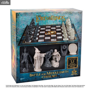 Jeu d'échecs officiel Battle for Middle Earth du Seigneur des Anneaux mesurant environ 47 x 47 centimètres. Les pièces mesurent environ entre 5 et 11 cm. Le fabricant est Noble Collection.