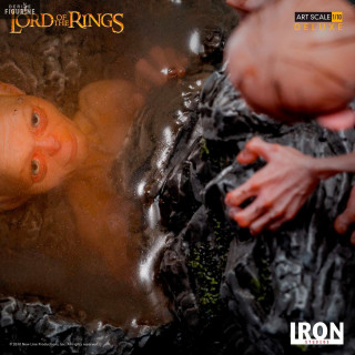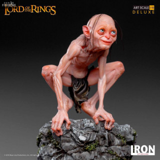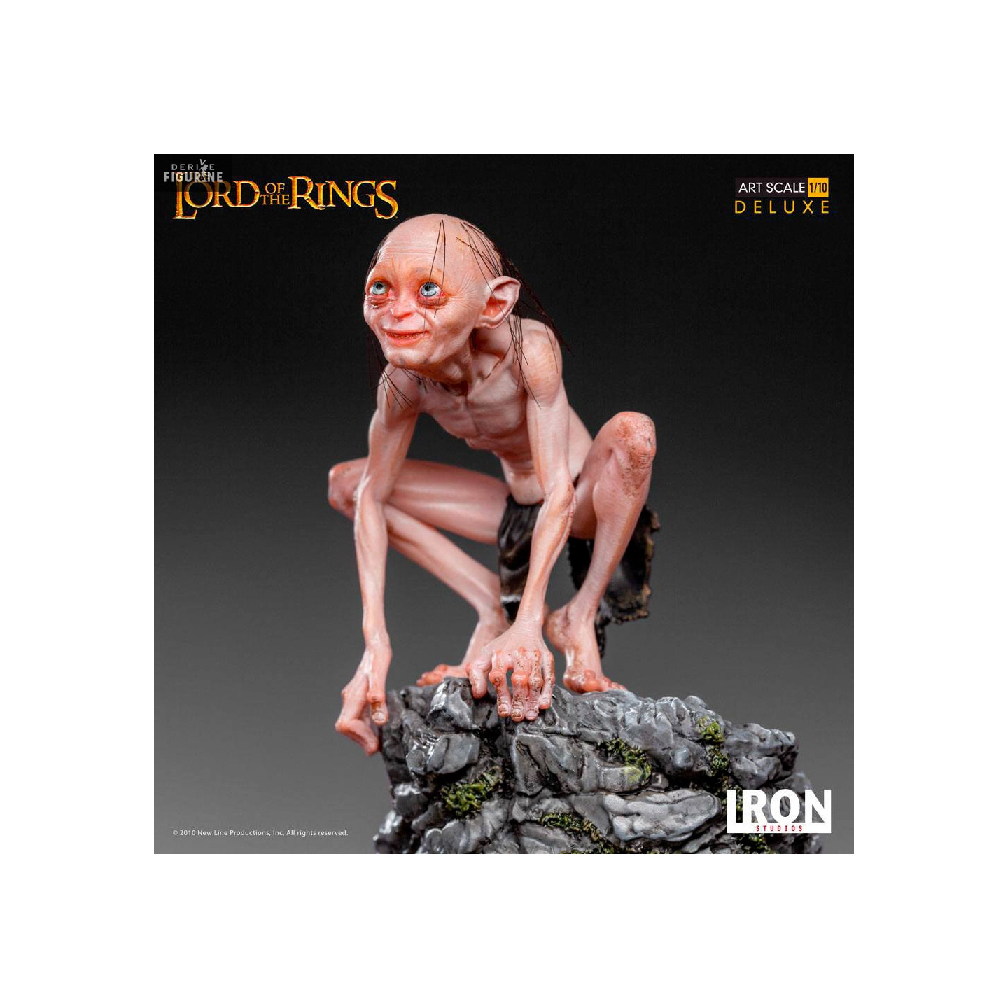 Figurine officielle de Gollum en résine mesurant environ 12 centimètres de haut, à l'échelle 1/10. Elle est issue de la collection Deluxe Art Scale. Le fabricant est Iron Studios.