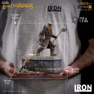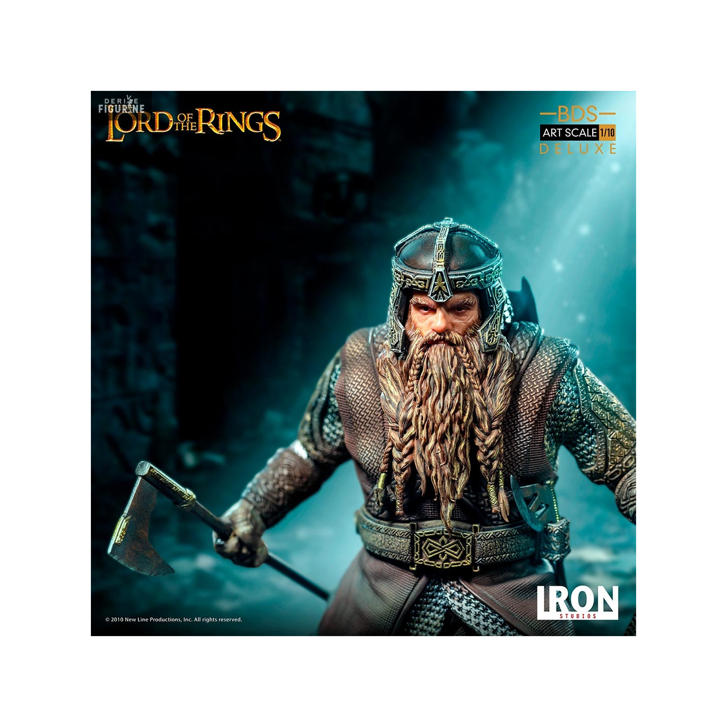 Figurine officielle de Gimli en résine mesurant environ 21 centimètres de haut, à l'échelle 1/10. Elle est issue de la collection BDS Art Scale Deluxe. Le fabricant est Iron Studios.