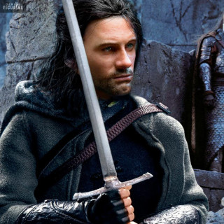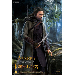 Aragorn a perdu son père très jeune, alors qu'il n'avait que deux ans et a ensuite été élevé par Elrond jusqu'à ses vingt ans. Cette figurine le représente avec les cheveux longs, des vêtements en tissu et plusieurs armes, telles qu'un arc et des flèches.