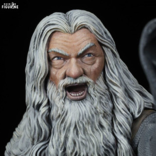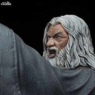 La figurine dépeint Gandalf dans une posture dynamique, brandissant son bâton et son épée avec détermination, sur un socle qui évoque les rochers escarpés des mines de la Moria. Les détails méticuleux de ses vêtements, de sa texture et de ses accessoires témoignent de l’attention portée par SD Toys pour offrir une représentation fidèle et impressionnante du personnage.