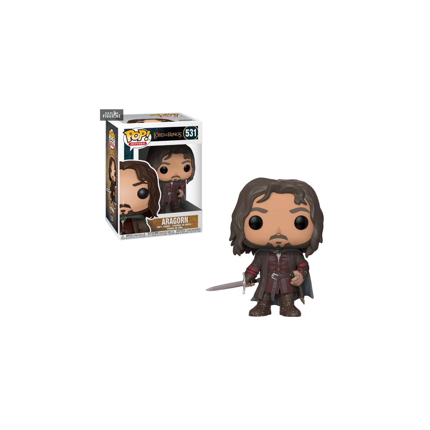 Figurine officielle d'Aragorn en vinyle d'environ 9 centimètres de haut. Le fabricant est Funko. Disponible un peu moins chère avec une boîte endommagée (voir photo).