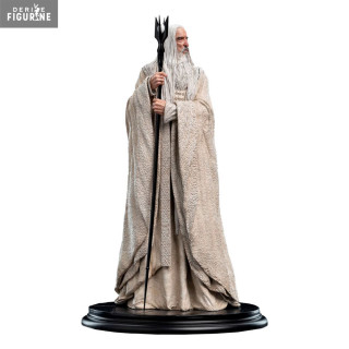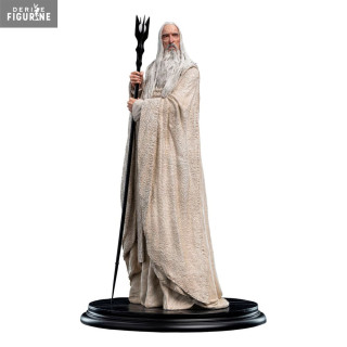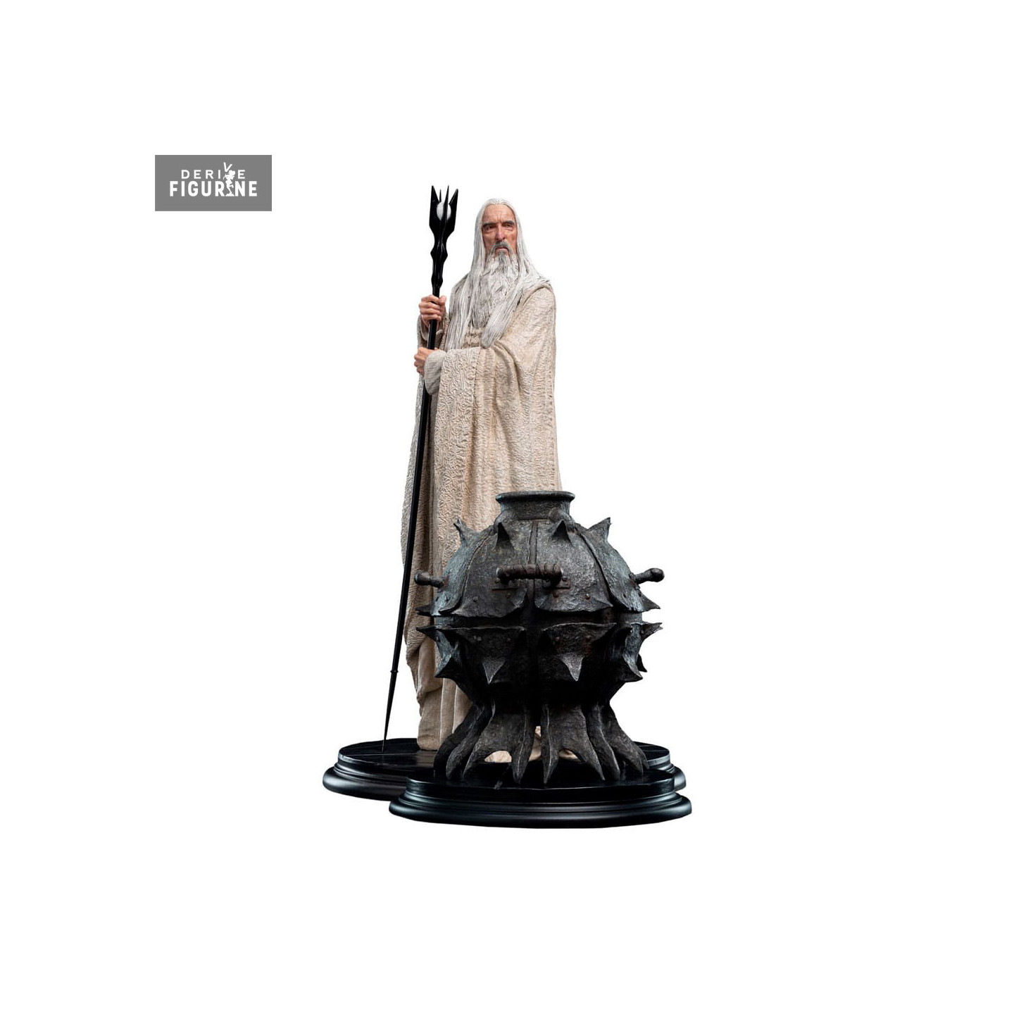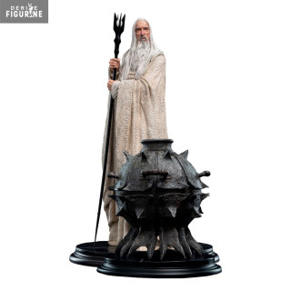 Figurine officielle de Saruman en résine mesurant environ 20,5 x 33,5 x 20,5 centimètres, à l'échelle 1/6. Le fabricant est Weta Workshop.