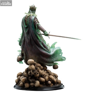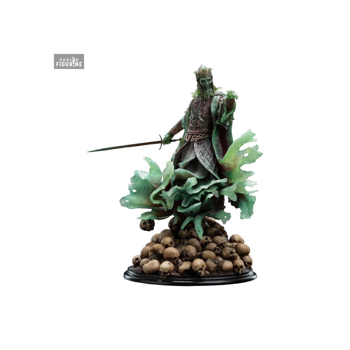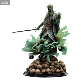 La pose dynamique du Roi des Morts, debout sur un monticule de crânes, épée à la main et vêtu de son armure spectralement corrodée, est impressionnante. Les détails complexes de son armure, ainsi que les textures et les effets de vieillissement, témoignent du souci du détail de Weta Workshop. La peinture méticuleuse donne vie à l'apparence spectrale du Roi, avec des nuances de vert et de gris qui simulent l'éthéréité et la décadence de son existence spectrale.