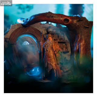 Rhosgobel, la demeure de Radagast, est représentée dans toute sa splendeur, nichée au cœur d’une forêt dense. La figurine montre Radagast, habillé de ses robes en lambeaux, sortant de sa maison entourée de potions, de livres et d'objets mystérieux, renforçant l'atmosphère mystique de ce magicien unique en son genre. Le détail de la sculpture est absolument remarquable, de l'écorce des arbres aux pierres qui entourent la porte en bois de Rhosgobel, sans oublier la texture du costume de Radagast et sa barbe hirsute.