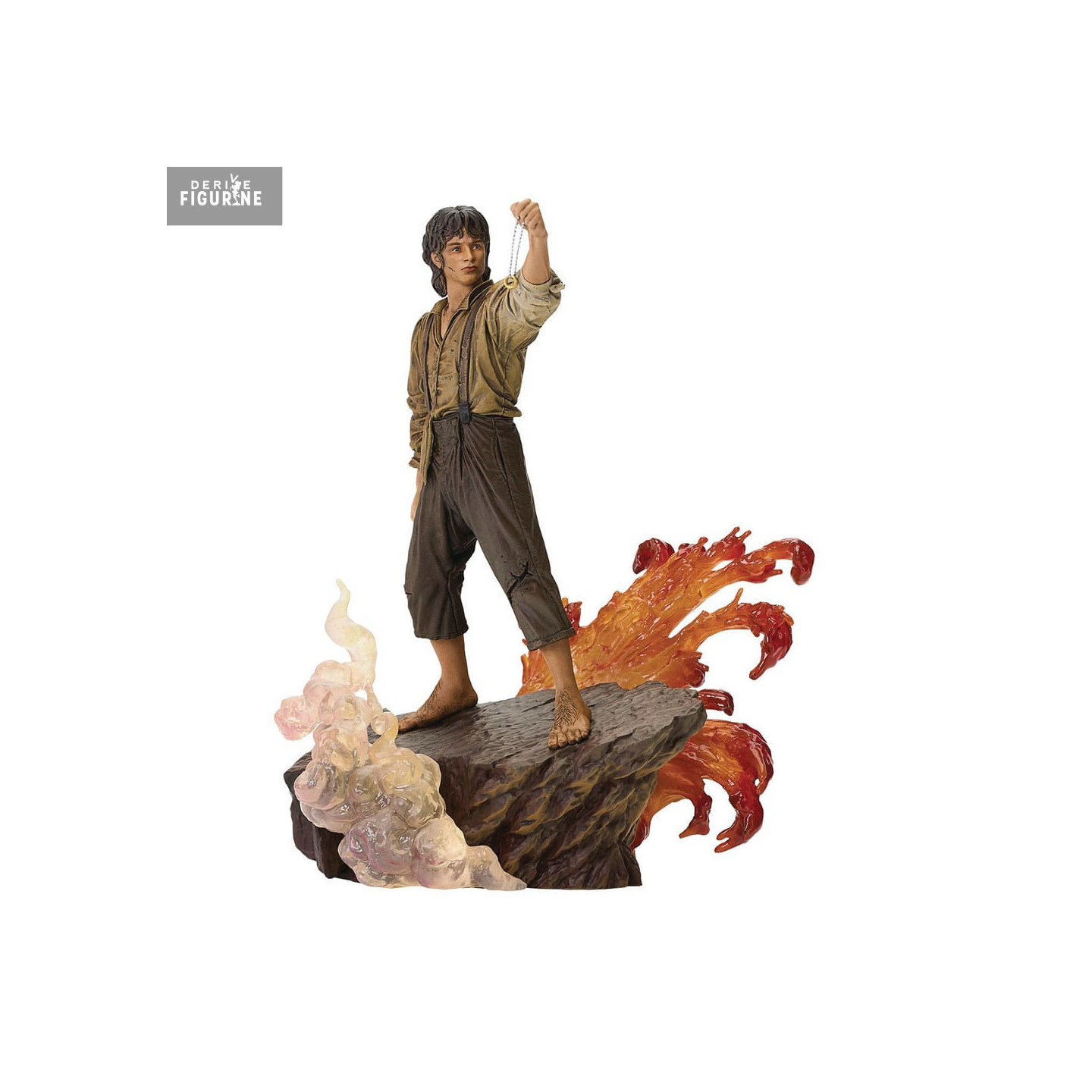 Cette figurine représente Frodo dans l’un des moments les plus emblématiques de la trilogie, tenant l’Anneau Unique alors qu'il se tient sur un rocher, avec une spectaculaire base illustrant l’effusion de flammes et de fumée, symbolisant la lutte finale contre les forces du mal. Le soin apporté aux détails est impressionnant, des textures de ses vêtements usés par les épreuves, jusqu’à l’expression de détermination sur son visage, capturant parfaitement l’essence de ce personnage héroïque.