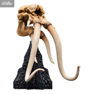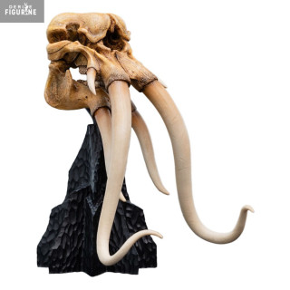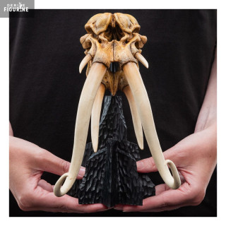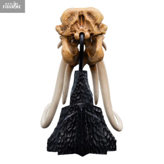 Réalisé en polystone, ce modèle présente une reproduction minutieuse des formes osseuses : arcade crânienne fendue, cavités orbito-temporales profondes et quatre longues défenses torsadées reproduites à l’échelle. La patine sable et ivoire accentue l’aspect vieilli des os, tandis que la base sculptée en bois noir mat imite un piédestal taillé dans la roche.