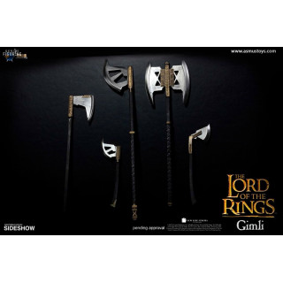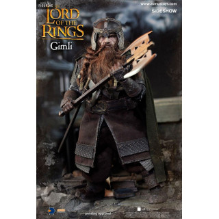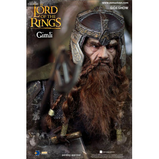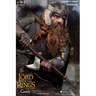 Figurine officielle de Gimli mesurant environ 20 centimètres de haut, à l'échelle 1/6. Le fabricant est Asmus Collectible Toys.