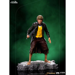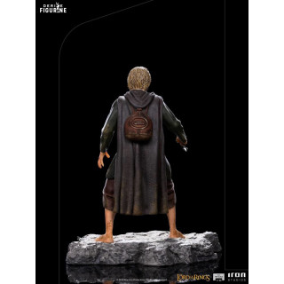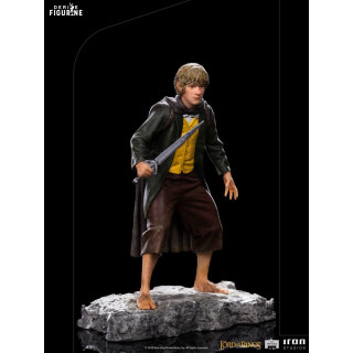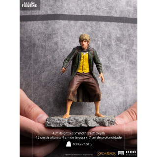 Figurine officielle de Meriadoc Brandebouc en résine mesurant environ 12 x 9 x 7 centimètres, à l'échelle 1/10. Elle est issue de la collection BDS Art Scale. Le fabricant est Iron Studios.