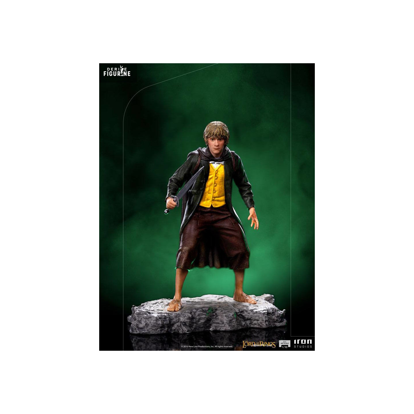 Avec des dimensions d’environ 12 x 9 x 7 cm à l’échelle 1/10, la figurine repose sur un socle évoquant les terres rocailleuses de la Terre du Milieu. Elle peut être exposée seule ou intégrée à un diorama complet avec les autres membres de la Communauté. Un hommage sobre mais puissant à l’un des hobbits les plus téméraires du Seigneur des Anneaux.