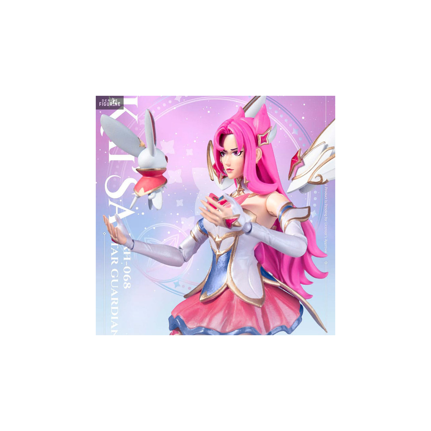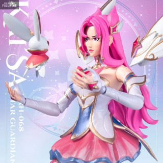Kai'Sa est une jeune femme qui a grandi aux côtés du Neant et n'a réussi a y survivre que par sa détermination. Depuis, elle est devenue une tueuse très douée, et l'avenir des hommes est entre ses mains, devant choisir si elle laisse les ténèbres s'abattre sur le monde ou les stopper. Ici, elle porte un skin plutôt rayonnant, puisqu'il s'agit de la gardienne des étoiles. Elle est articulée, possède des accessoires et parties interchangeables ainsi qu'un petit compagnon trop mignon.
