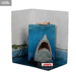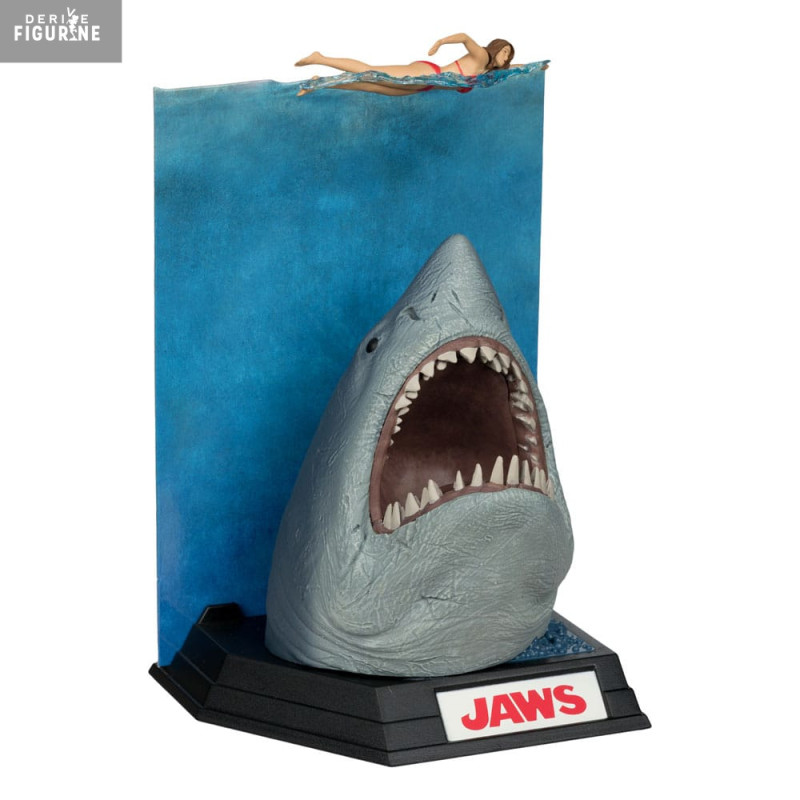 Cette pièce de 16 cm, issue de la collection Movie Maniacs de McFarlane Toys, joue la carte du réalisme cinématographique. Le grain de la peau, les cicatrices et la texture rugueuse du requin contrastent avec la couleur vibrante du maillot de bain et le profil délicat du décor aquatique. Le fond bleu dégradé suggère le bas-fonds menaçants, tandis que le socle noir orné du logo JAWS renforce l’impression d’affronter un classique intemporel.