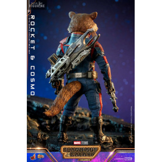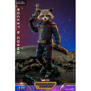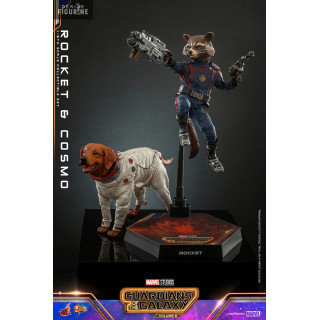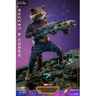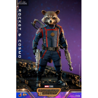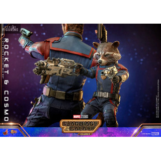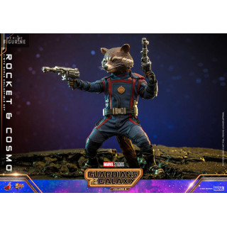 Figurines officielles de Rocket et Cosmo mesurant environ 16 centimètres de haut, à l'échelle 1/6. Elles sont issues de la collection Movie Masterpiece. Le fabricant est Hot Toys.