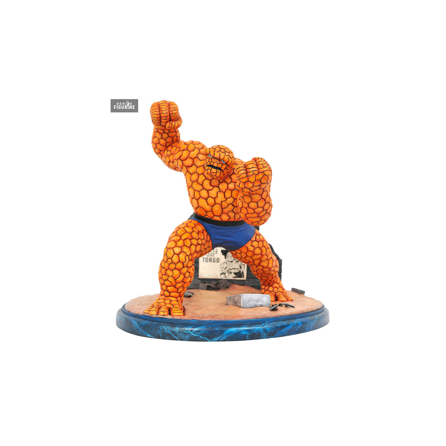 Benjamin Grimm est l'un des 4 Fantastiques et son élément est celui de la Terre. On peut dire que ses pouvoirs se sont développés grâce à des radiations cosmiques et depuis, il a l'apparence d'un rocher géant. Il possède une résistance et une force beaucoup plus importante qu'un simple humain et malgré son physique dur, il a tout de même un cœur tendre. On peut voir Torgo sur l'affiche derrière lui et sachez qu'il est limité à seulement 3 000 exemplaires avec certificat d'authenticité.