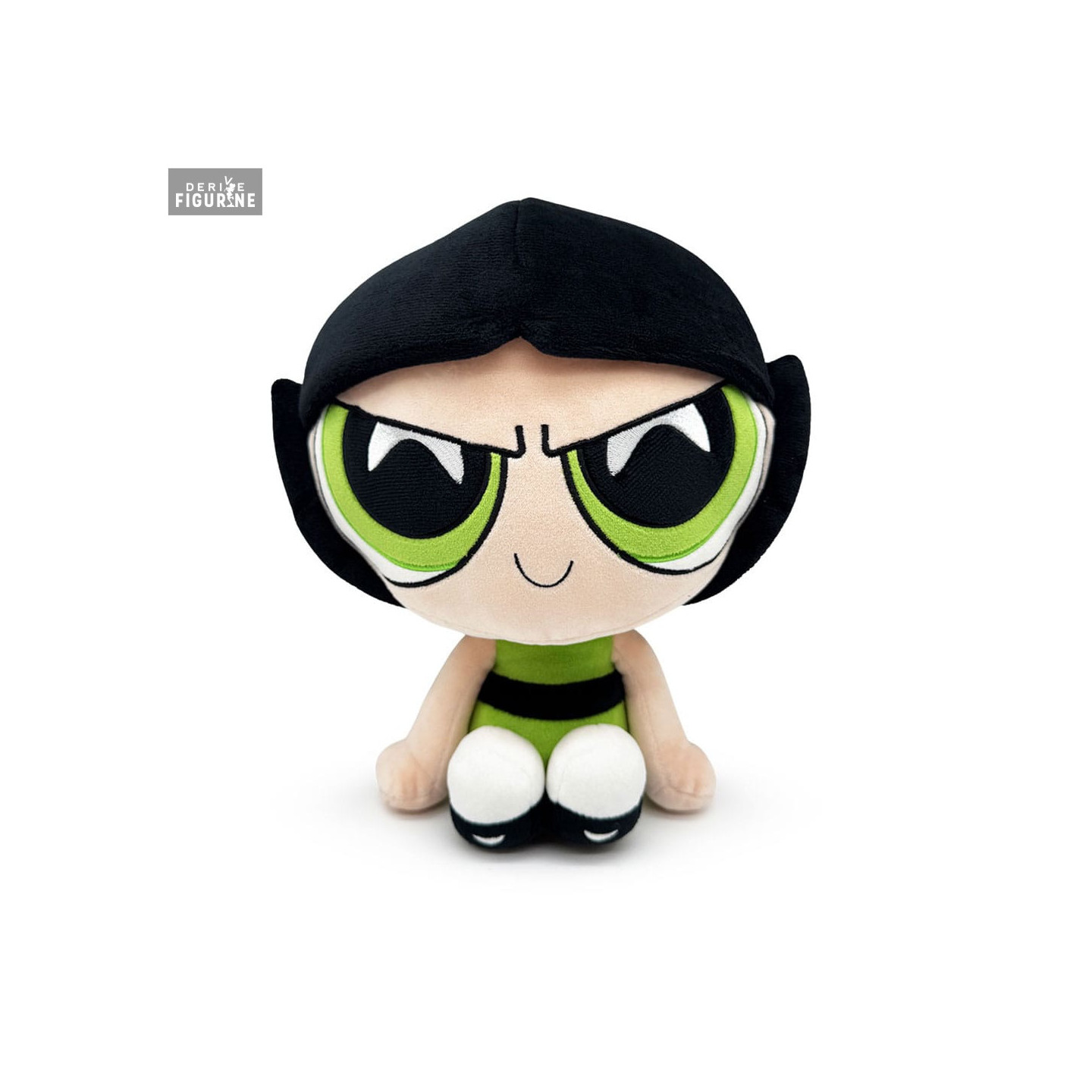 La sculpture restitue fidèlement son look iconique : une tête oversize en velours chair claire surmontée de mèches noires sculptées, et ses grands yeux verts brodés qui lancent un regard résolu. Assise en position de combat, elle porte sa robe verte à bandeau noir, ses collants blancs et ses bottines assorties, soulignant le contraste entre douceur et puissance.
