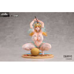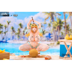Issue du jeu vidéo Daiblos Core, Aymur est présentée ici dans une version estivale totalement déjantée : Honey Assault. Dans cette scène à la fois comique et audacieuse, on la découvre accroupie sur une plage, prête à asséner un coup sur un durian à l’aide d’un bâton. Une posture absurde, un regard concentré, et un humour visuel parfaitement assumé.