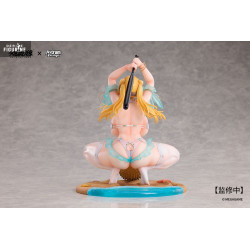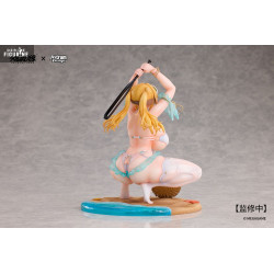 Côté tenue, elle arbore un bikini orné de rubans turquoise et dorés, des manches transparentes en tulle et des accessoires dorés : collier, bracelets, et lunettes de soleil relevées sur la tête. Les détails sculptés sont nets, des plis du tissu jusqu’aux reflets sur la peau. Le socle représente une plage avec du sable, des coquillages, et une ambiance estivale bien rendue.
