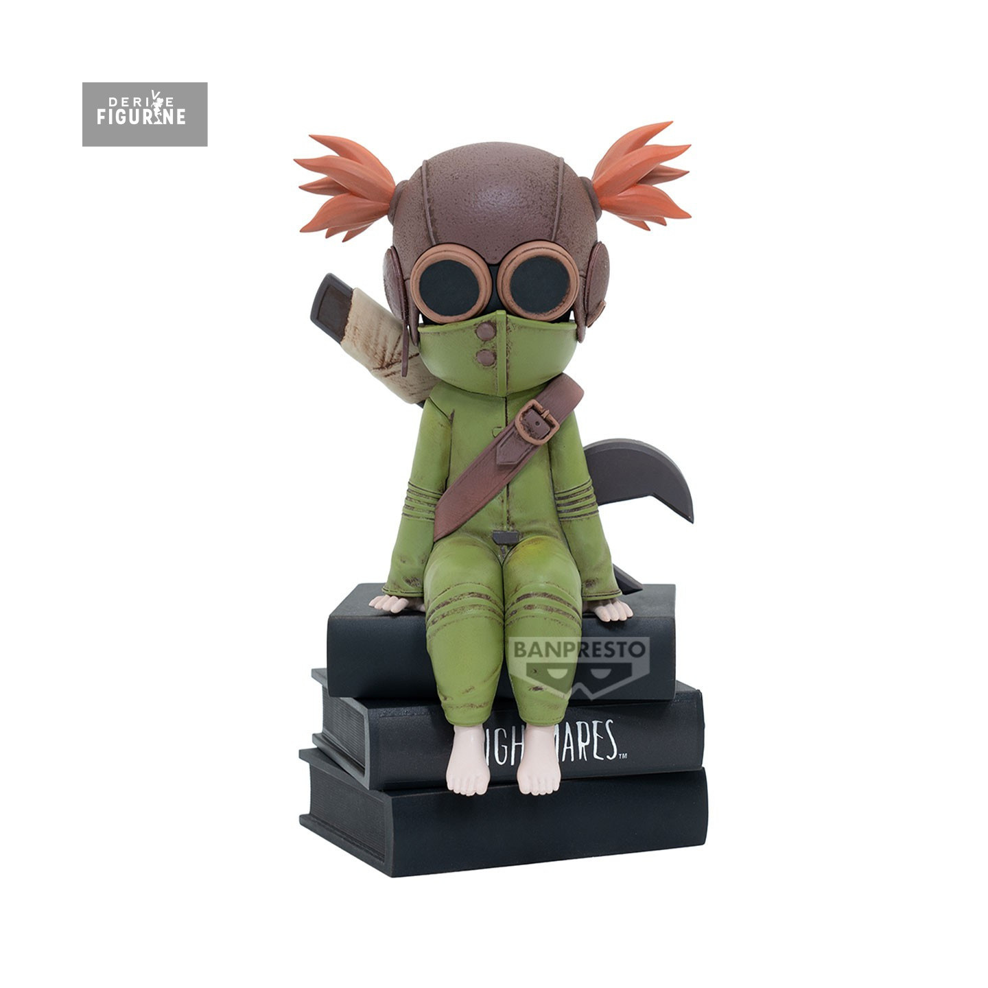 Voici Alone, l’un des visages les plus troublants de Little Nightmares II, capturé dans un instant de répit au sommet de sa pile de livres sinistres. Dans le jeu, Alone est une créature mi-enfant, mi-monstre : sous son masque de soudeur se cache un être tourmenté, pris au piège d’un environnement étouffant et cruel. Assise calmement, elle semble suspendue entre la vulnérabilité d’un enfant et la menace que suggère son arme tranchante.