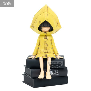 Sculptée en PVC d’environ 12 cm, Six est assise sur une pile de livres noirs au titre The Nightmares, comme pour marquer la frontière entre la réalité et ce cauchemar éveillé. Chaque détail de son imperméable jaune patiné révèle l’usure de ses aventures : plis prononcés, éraflures subtiles et légères décolorations. Ses cheveux noirs, semblant peser sous la capuche, et ses doigts fins, posés délicatement sur le socle, renforcent l’impression d’une fragile présence en équilibre.