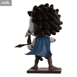 Cette figurine vinyle saisit parfaitement le style visuel de la série. Low y apparaît concentré, prêt à tirer une flèche avec son arc artisanal en bois et corde. Son masque blanc au long bec dissimule son visage, renforçant l’atmosphère de mystère propre à l’univers du jeu. Sa tenue est simple : cape bleue, short effrangé, bracelet en perles bleues à la cheville — des détails discrets mais riches de sens.