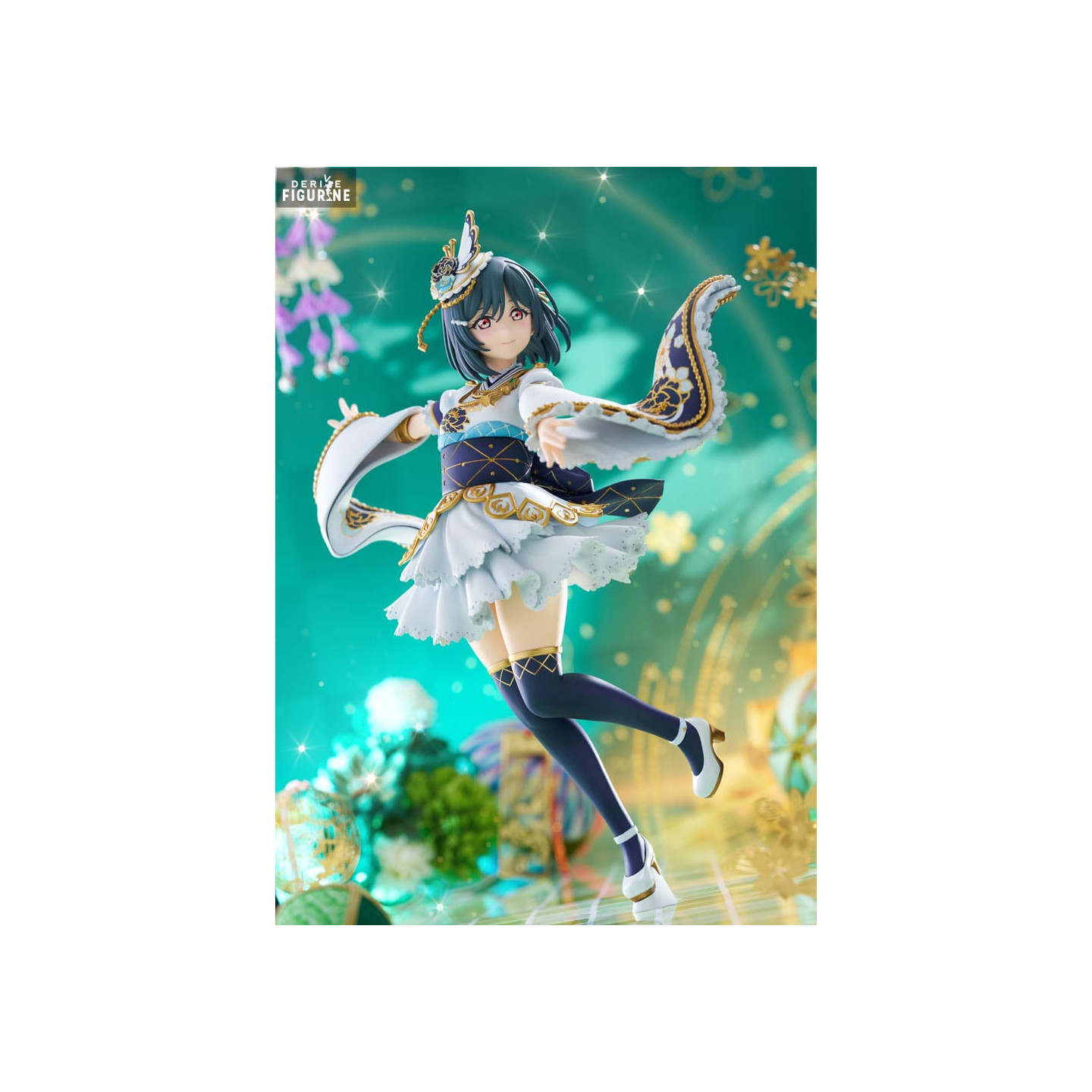 Shioriko Mifune est un personnage au charme unique, connu pour sa passion pour la musique et son dévouement envers ses camarades du Club des Idoles de l'Académie Nijigasaki. Dans cette figurine, elle est représentée dans une tenue de performance magnifique, ornée de détails dorés et de motifs complexes qui reflètent son style distinctif et son esprit d'idole. Sa jupe évasée, bordée de dentelle délicate, virevolte autour d'elle, capturant un instant de mouvement et d'émotion.